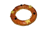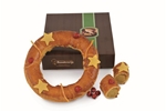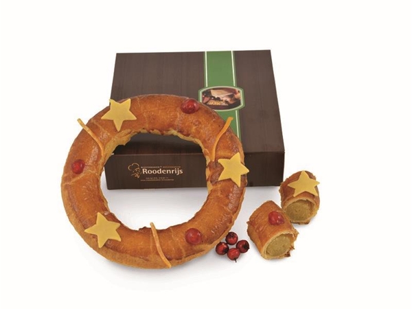 Roomboterbladerdeeg gevuld met zuivere amandelspijs en amarenekersen, gedecoreerd met kerstdecoratie.