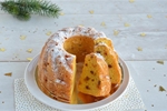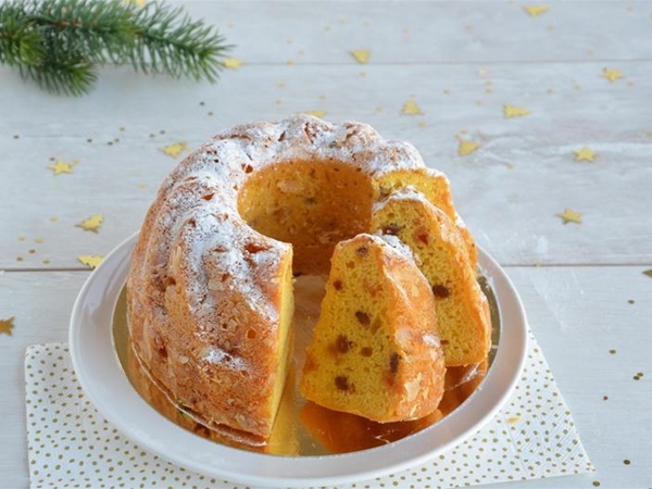 Speciaal recept! Onze beroemde tulband van roombotercake met vruchtjes, gedompeld in de roomboter en bestrooid met poedersuiker.